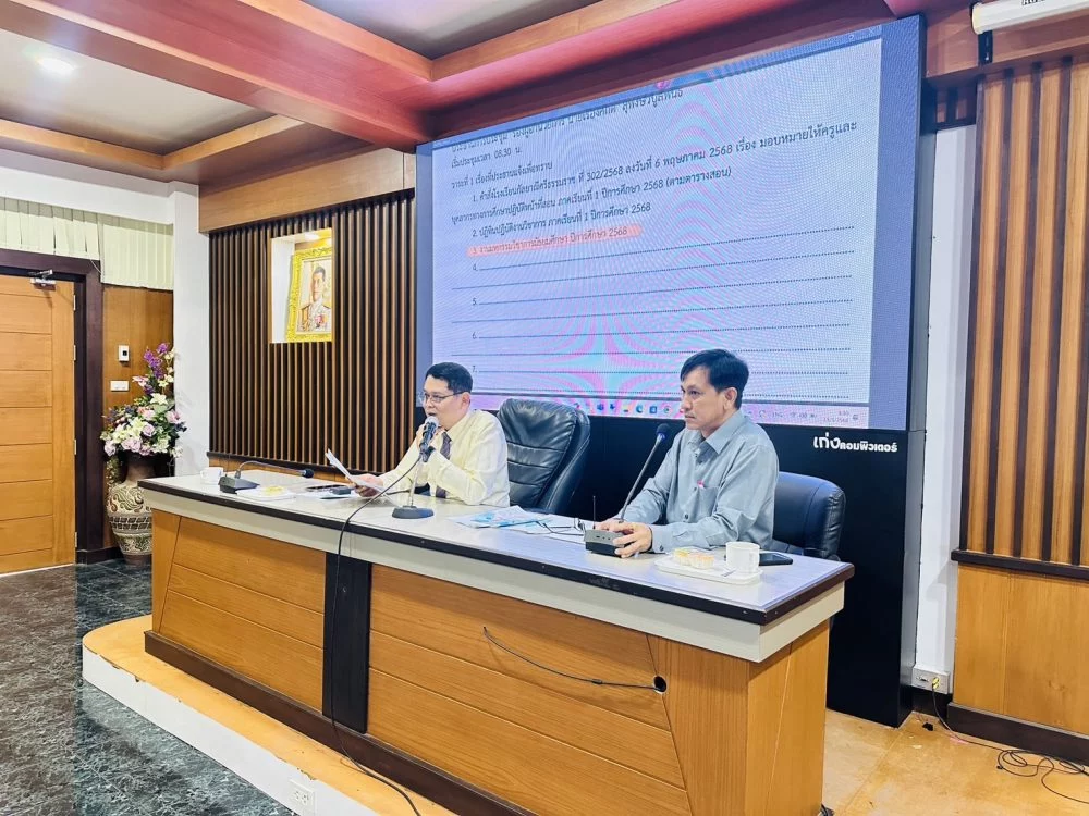 วันที่ 15 พฤษภาคม 2568 เวลา 08.30 น. นายสมพงษ์ ปานหงษ์ ผู้อำนวยการโรงเรียนกัลยาณีศรีธรรมราช เป็นประธานในการประชุมคณะกรรมการกลุ่มบริหารงานวิชาการ ครั้งที่ 1 ปีการศึกษา 2568 โดยมีนายเรืองศักดิ์ สุพงษ์วิบูลพันธ์ รองผู้อำนวยการกลุ่มบริหารงานวิชาการ นายวัชรินทร์ ธรรมชาติ รองผู้อำนวยการกลุ่มบริหารงานงบประมาณและบุคคล พร้อมด้วยหัวหน้างาน หัวหน้ากลุ่มสาระฯ และบุคลากรที่เกี่ยวข้อง เข้าร่วมประชุม ณ ห้องประชุมกัลยาณีศรีธรรมราช