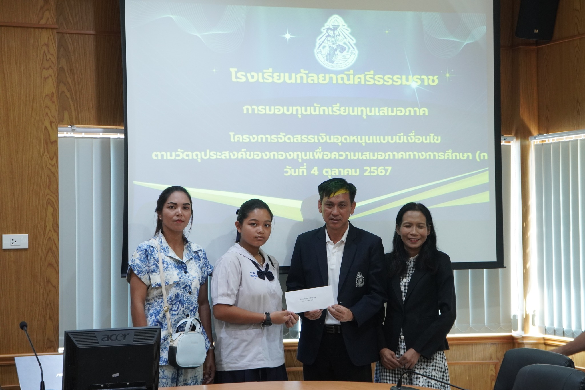 วันที่ ๔ ตุลาคม ๒๕๖๗ เวลา ๐๙.๐๐ น. นายเรืองศักดิ์ สุพงษ์วิบูลพันธ์ รองผู้อำนวยการ รักษาราชการแทน ผู้อำนวยการโรงเรียนกัลยาณีศรีธรรมราช เป็นประธานในการมอบทุนนักเรียนทุนเสมอภาค โครงการจัดสรรเงินอุดหนุนแบบมีเงื่อนไข ตามวัตถุประสงค์ของกองทุนเพื่อความเสมอภาคทางการศึกษา โดยมีนายวัชรินทร์ ธรรมชาติ รองผู้อำนวยการกลุ่มบริหารงานงบประมาณและบุคคล พร้อมด้วยคณะครูที่เกี่ยวข้อง เข้าร่วมพิธี ณ ห้องประชุมศรีปราชญ์ โรงเรียนกัลยาณีศรีธรรมราช