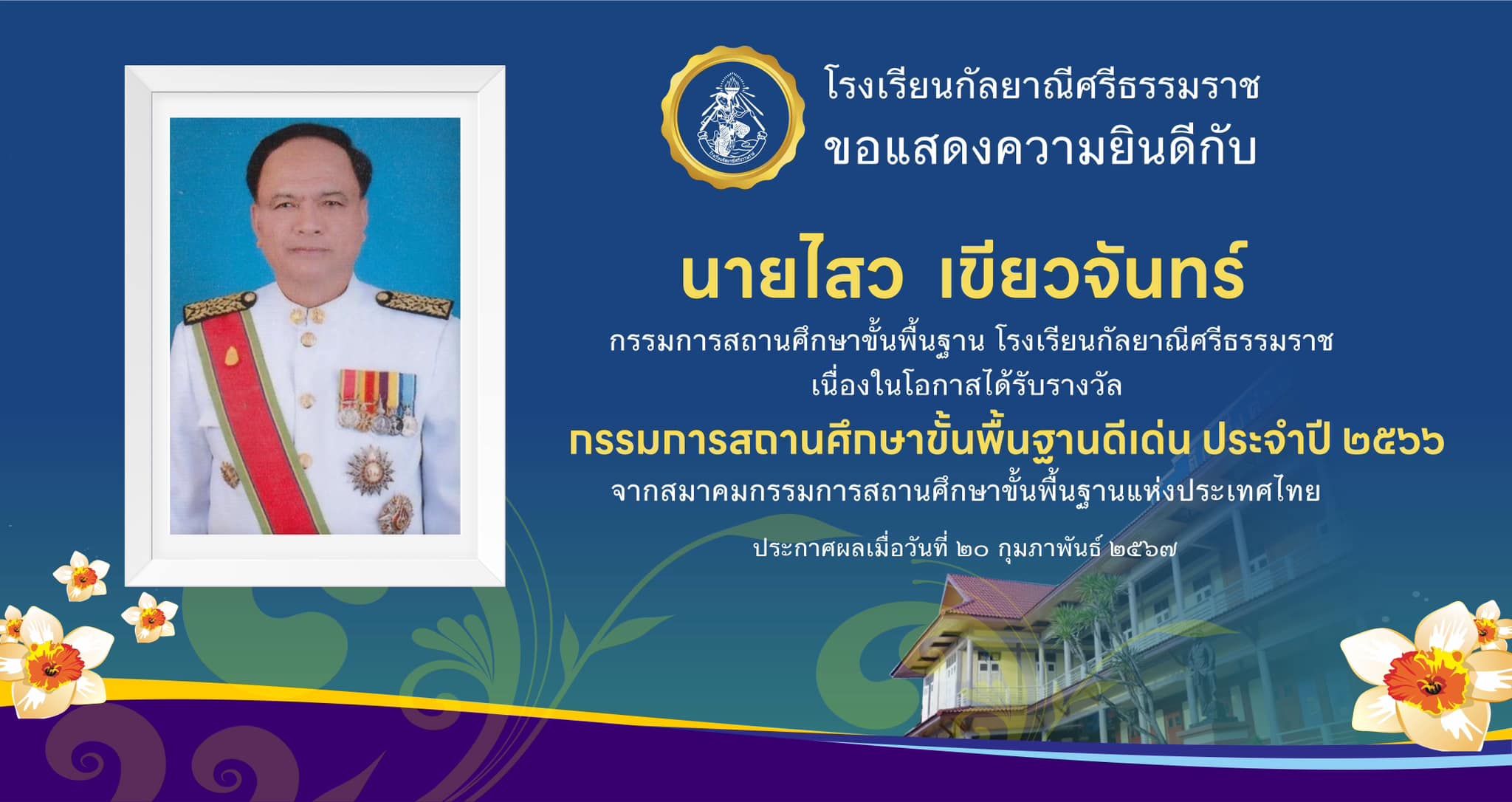 ขอแสดงความยินดีกับนายไสว เขียวจันทร์ กรรมการสถานศึกษาขั้นพื้นฐานโรงเรียนกัลยาณีศรีธรรมราช ได้รับรางวัลกรรมการสถานศึกษาขั้นพื้นฐานดีเด่น ประจำปี ๒๕๖๖ จากสมาคมกรรมการสถานศึกษาขั้นพื้นฐานแห่งประเทศไทย