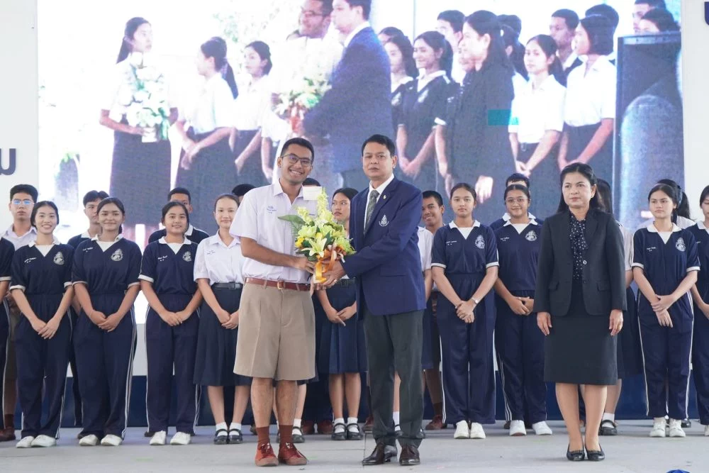 คณะกรรมการสภานักเรียนฯ แสดงความยินดีและมอบช่อดอกไม้แด่ท่านผู้อำนวยการ และท่านรองผู้อำนวยการ โอกาสย้ายมาดำรงตำแหน่งใหม่