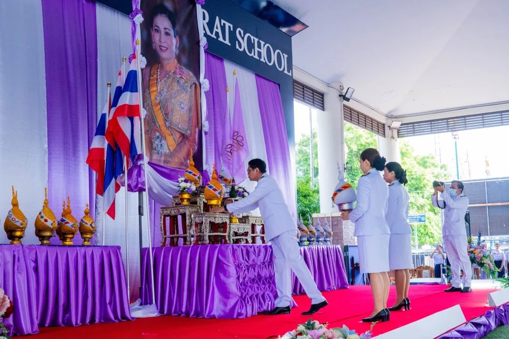 วันที่ 29 พฤษภาคม 2568 เวลา 08.00 น. นายสมพงษ์ ปานหงษ์ ผู้อำนวยการโรงเรียนกัลยาณีศรีธรรมราช เป็นประธานในพิธีเฉลิมพระเกียรติและถวายพระพรชัยมงคล เนื่องในโอกาสวันเฉลิมพระชนมพรรษา สมเด็จพระนางเจ้าสุทิดา พัชรสุธาพิมลลักษณ พระบรมราชินี เพื่อเทิดทูนและแสดงความจงรักภักดี สำนึกในพระมหากรุณาธิคุณ โดยมีคณะผู้บริหาร ครู บุคลากร ตัวแทนนักเรียน คณะกรรมการสภานักเรียน นักศึกษาวิชาทหาร กิจกรรมพัฒนาผู้เรียน ศูนย์ครอบครัวพอเพียง และผู้ประกอบการร้านค้า ร่วมวางพานพุ่มเงิน-พุ่มทอง ถวายเครื่องราชสักการะ และลงนามถวายพระพรชัยมงคล ณ อาคารอเนกประสงค์ 100 ปี กัลยาณีศรีธรรมราช