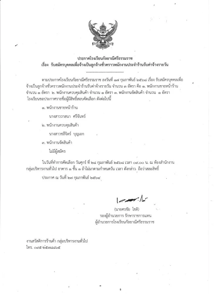 รับสมัครบุุคคลเพื่อจ้างเป็นลูกจ้างชั่วคราวพนักงานประจำร้าน