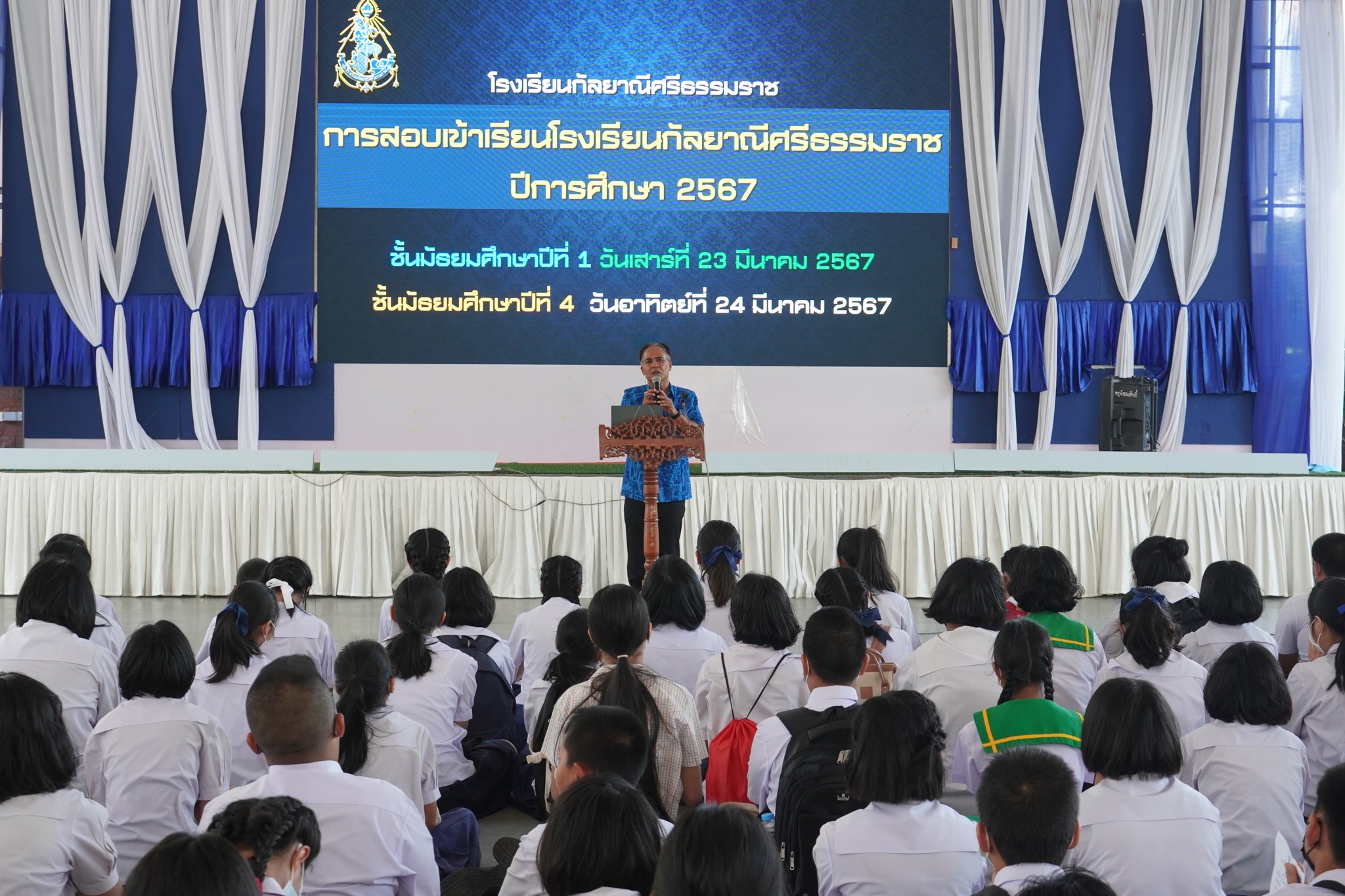 วันเสาร์ที่ ๒๓ มีนาคม ๒๕๖๗ เวลา ๐๗.๔๐ น. นายสง่า นาวารัตน์ ผู้อำนวยการโรงเรียนกัลยาณีศรีธรรมราช กล่าวต้อนรับและให้โอวาทนักเรียนที่มาสอบเข้าศึกษาต่อในระดับชั้นมัธยมศึกษาปีที่ ๑ โรงเรียนกัลยาณีศรีธรรมราช ปีการศึกษา ๒๕๖๗ ประเภทห้องเรียนปกติ ณ อาคารอเนกประสงค์ ๑๐๐ ปี กัลยาณีฯ