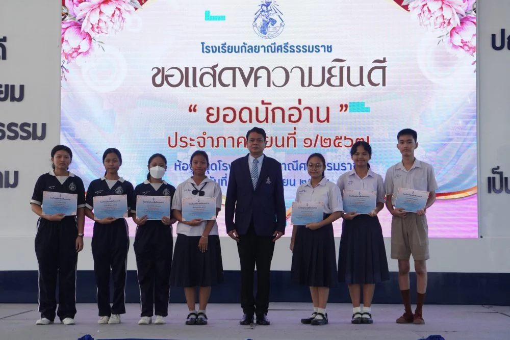 วันที่ ๑ พฤศจิกายน ๒๕๖๗ เวลา ๐๘.๐๐ น. นายสมพงษ์ ปานหงษ์ ผู้อำนวยการโรงเรียนกัลยาณีศรีธรรมราช เป็นประธานในพิธีมอบเกียรติบัตรแก่นักเรียนที่ผ่านการคัดเลือกเป็น “ยอดรักอ่าน” กิจกรรมสร้างนิสัยรักการอ่าน ประจำภาคเรียนที่ ๑ ปีการศึกษา๒๕๖๗ จำนวน ๗ คน ประกอบด้วย