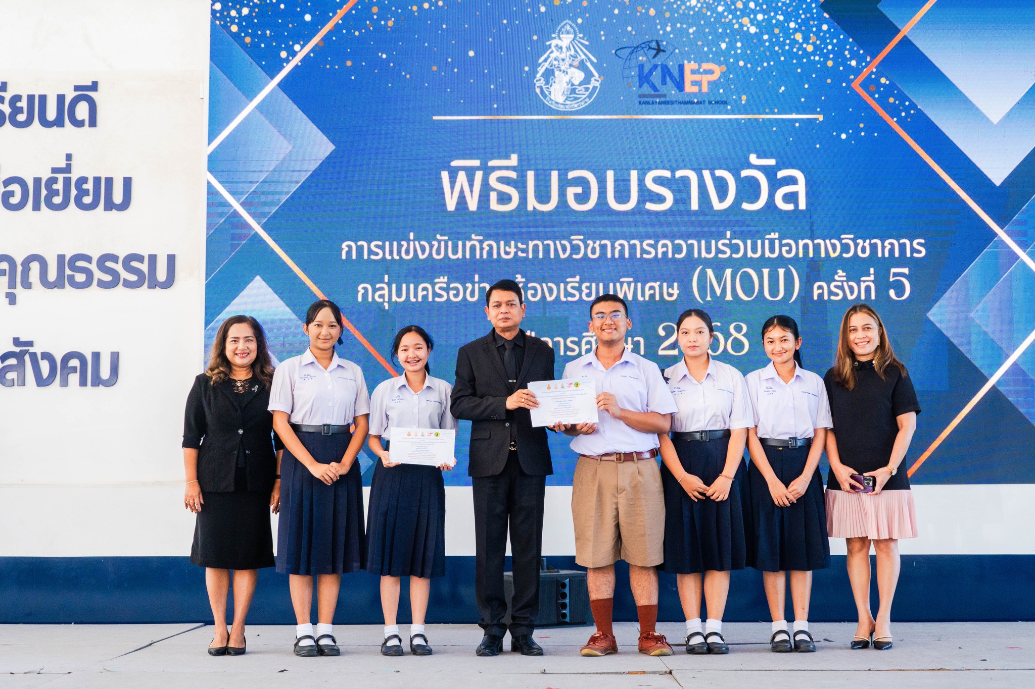 วันที่ 4 พฤศจิกายน 2568 เวลา 08.00 น. นายสมพงษ์ ปานหงษ์ ผู้อำนวยการโรงเรียนกัลยาณีศรีธรรมราช เป็นประธานในพิธีมอบเกียรติบัตรแก่นักเรียนที่ได้รับรางวัลการแข่งขันทักษะวิชาการของกลุ่มเครือข่ายความร่วมมือทางวิชาการ นักเรียนห้องเรียนพิเศษ ครั้งที่ 5 (MOU) โดยมีคณะครูโครงการห้องเรียนพิเศษ EP/HUB ร่วมเป็นเกียรติ ณ อาคารอเนกประสงค์ 100 ปี กัลยาณีศรีธรรมราช