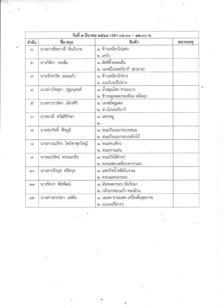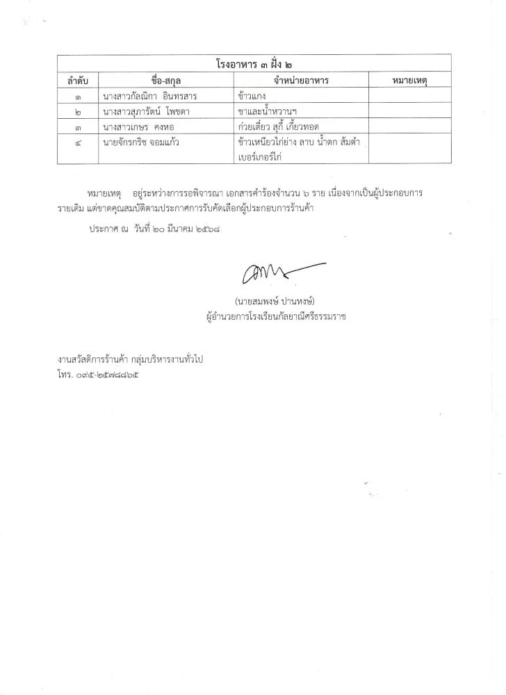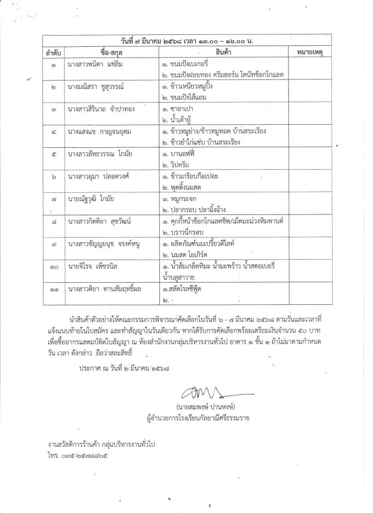 ประกาศรายชื่อผู้มีสิทธิ์เข้ารับการคัดเลือกบุคคลเพื่อส่งสินค้าประเภทอาหาร เครื่องดื่มจำหน่ายในร้านสหกรณ์ร้านค้า ร.ร.กัลยาณี