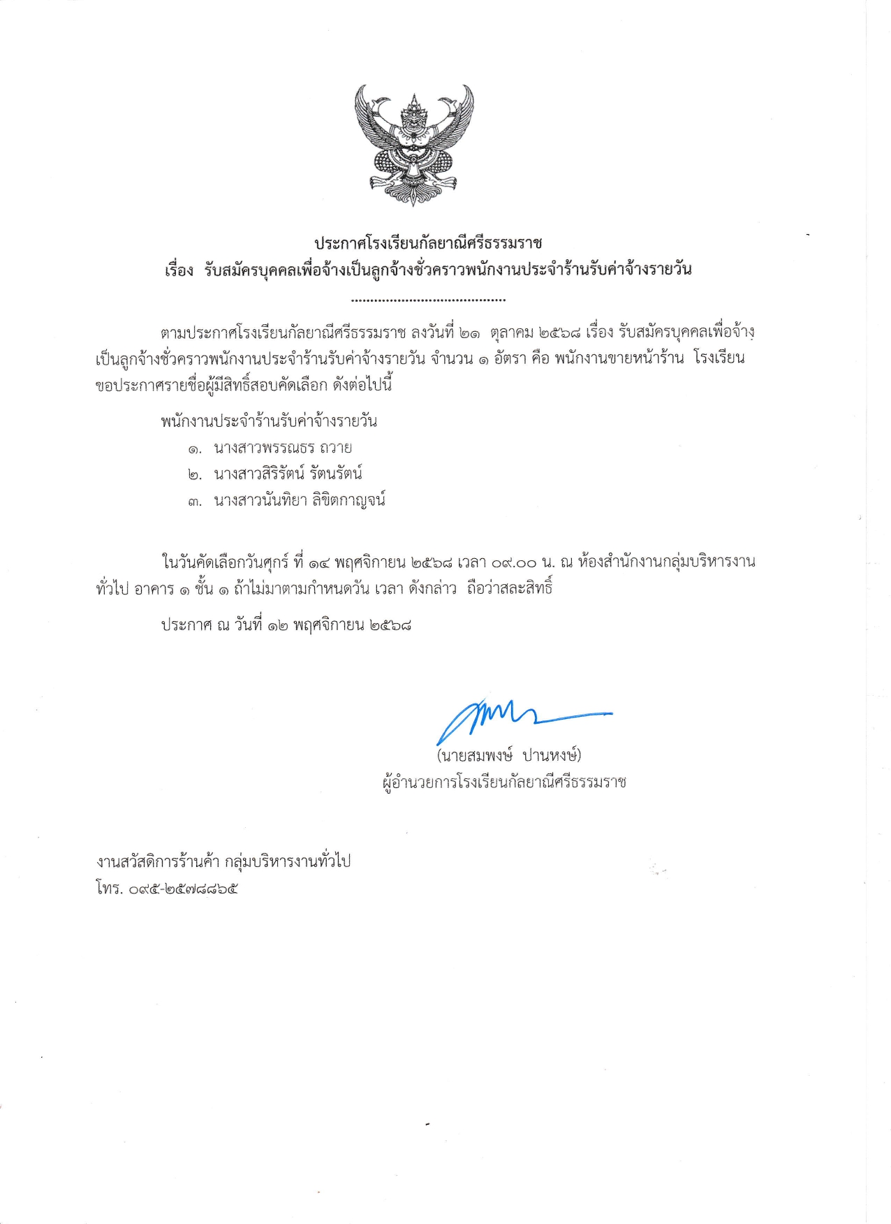 ข่าวประชาสัมพันธ์ ประกาศบัญชีรายชื่อผู้มีสิทธิ์สอบคัดเลือกลูกจ้างชั่วคราว ตำแหน่ง เจ้าหน้าที่โสตทัศนศึกษา18 ธันวาคม 2568