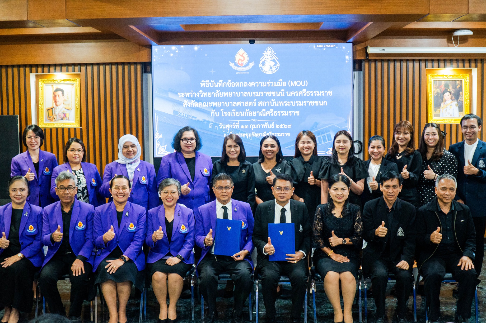 วันที่ 13 กุมภาพันธ์ 2569 เวลา 10.00 น. นายสมพงษ์ ปานหงษ์ ผู้อำนวยการโรงเรียนกัลยาณีศรีธรรมราช พร้อมด้วย ผู้บริหาร คณะครู นักเรียน และเครือข่ายผู้ปกครอง ตัวแทนโรงเรียนกัลยาณีศรีธรรมราช ได้ร่วมลงนามบันทึกข้อตกลงความร่วมมือ (MOU) กับวิทยาลัยพยาบาลบรมราชชนนี นครศรีธรรมราช สังกัดคณะพยาบาลศาสตร์ สถาบันพระบรมราชชนก เพื่อร่วมพัฒนาหลักสูตรแผนการเรียนวิทยาศาสตร์ – คณิตศาสตร์ ห้องเรียนวิทยาศาสตร์สุขภาพ ณ ห้องประชุมกัลยาณีศรีธรรมราช