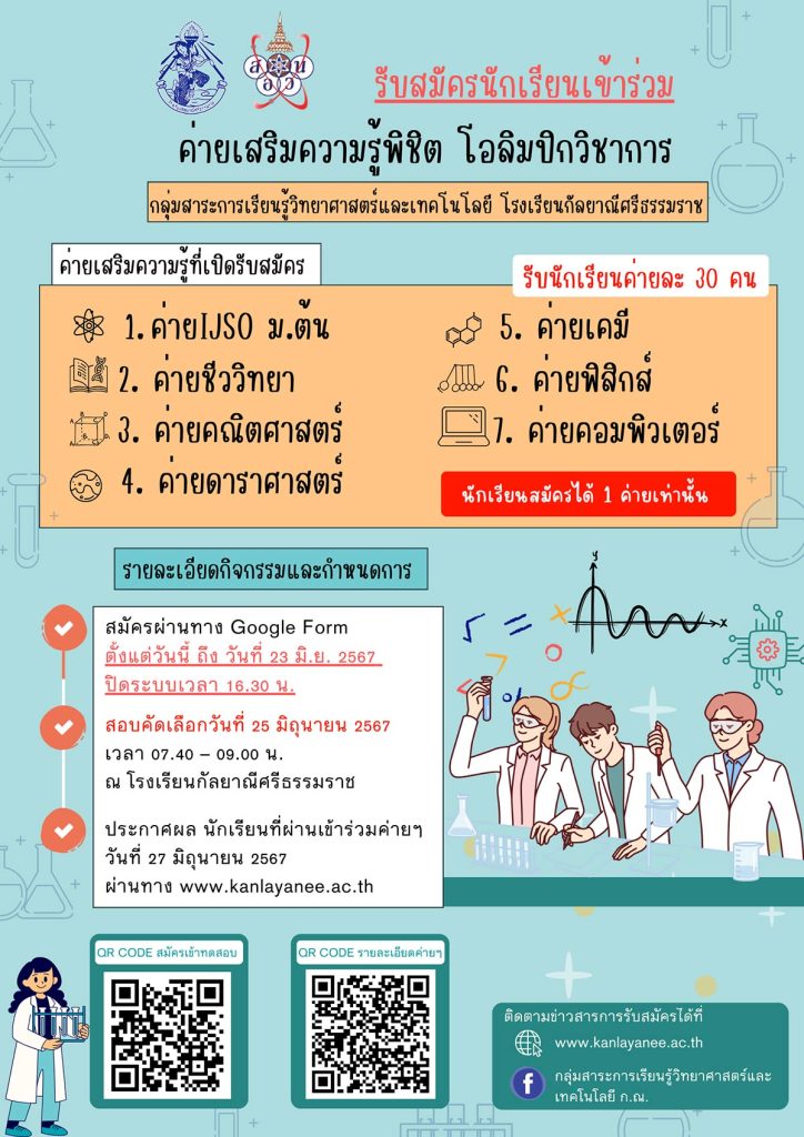 รับสมัครนักเรียนเข้าร่วมค่ายเสริมความรู้พิชิต โอลิมปิกวิชาการ สอวน. สาขาฟิสิกส์ เคมี ชีววิทยา
