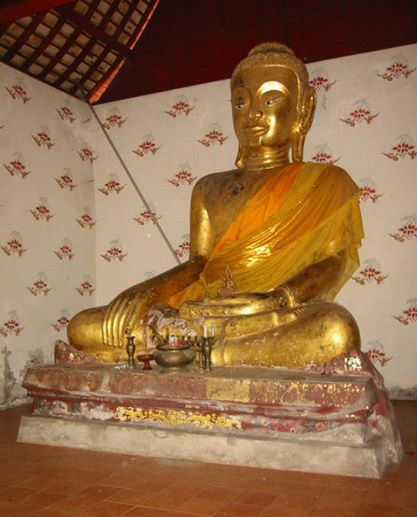 รูปแบบประติมากรรม ได้แก่ องค์พระพุทธรูปประธาน ปางมารวิชัย แกนพระพุทธรูปทำด้วยดินเหนียวโบกปูนปั้น องค์พระภายนอกขนาดหน้าตักกว้าง ๒.๔๐ เมตร สูง ๒.๘๐ เมตร ลักษณะอวบอ้วนพระพักตร์เป็นรูปสี่เหลี่ยม พระขนงโก่ง พระนาสิกงุ้ม พระโอษฐ์เป็นรูปคันศร พระศอเป็นริ้ว พระกรรณห้อยต่ำอยู่ใต้พระศก พระเกศาเกล้าเป็นมวย เม็ดพระศกเป็นขมวดปนเล็ก ยอดพระเกตุมาลาอาจหักหายไปครองผ้าสังฆาฏิเฉียงจากพระอังสาซ้ายมาจรดพระนาภี ศาสตราจารย์หม่อมเจ้าสุภัทรดิศ ดิศกุล ทรงวินิจฉัยว่าควรจัดอยู่ในสมัยพุทธศตวรรษที่ ๒๓ – ๒๔ สมัยอยุธยาตอนปลายหรือรัตนโกสินทร์ตอนต้น