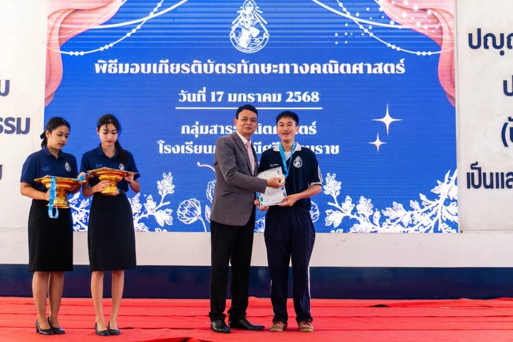 วันที่ ๑๗ มกราคม ๒๕๖๘ เวลา ๐๘.๐๐ น. นายสมพงษ์ ปานหงษ์ ผู้อำนวยการโรงเรียนกัลยาณีศรีธรรมราช เป็นประธานในพิธีมอบเกียรติบัตรแก่นักเรียนที่ได้รับรางวัลการแข่งขันทักษะคณิตศาสตร์