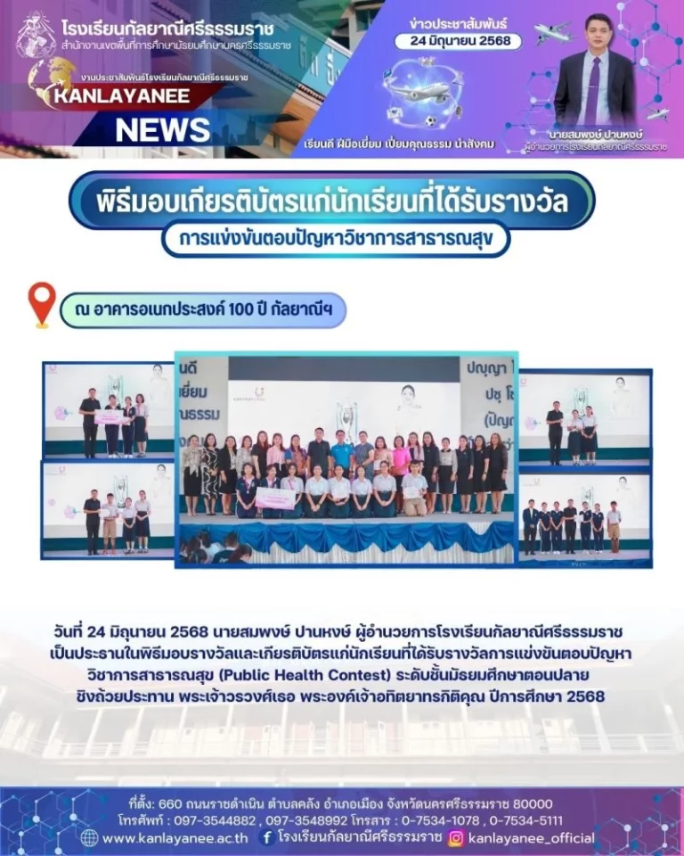 kanlayanee_new พิธีมอบเกียรติบัตรแก่นักเรียนที่ได้รับรางวัลการแข่งขันตอบปัญหาวิชาการสาธารณสุข24 มิถุนายน 25683 กรกฎาคม 2025
